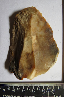 This flake tool stood out at a Flint Ridge quarry and workshop location as having a very old appearing patina and it looked to have been set up on a prepared core so as to center the flake on a white inclusion in the stone. When I later studied the flake I noticed what could be horse head imagery and showed it to Brennah, age 10, who happens to ride at an equestrian center on Flint Ridge. She said it had a "fish's mouth." Her mom looked at it and confirmed the "horse's mouth" was more like a fish mouth to her.