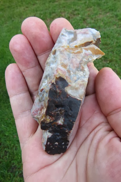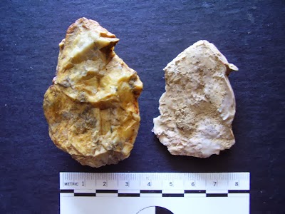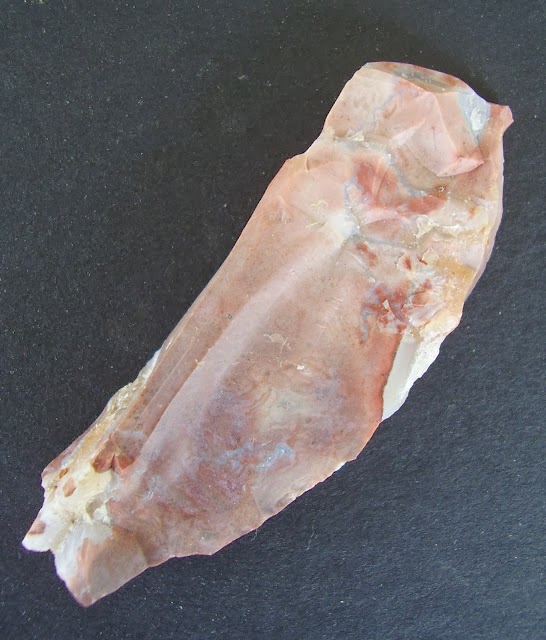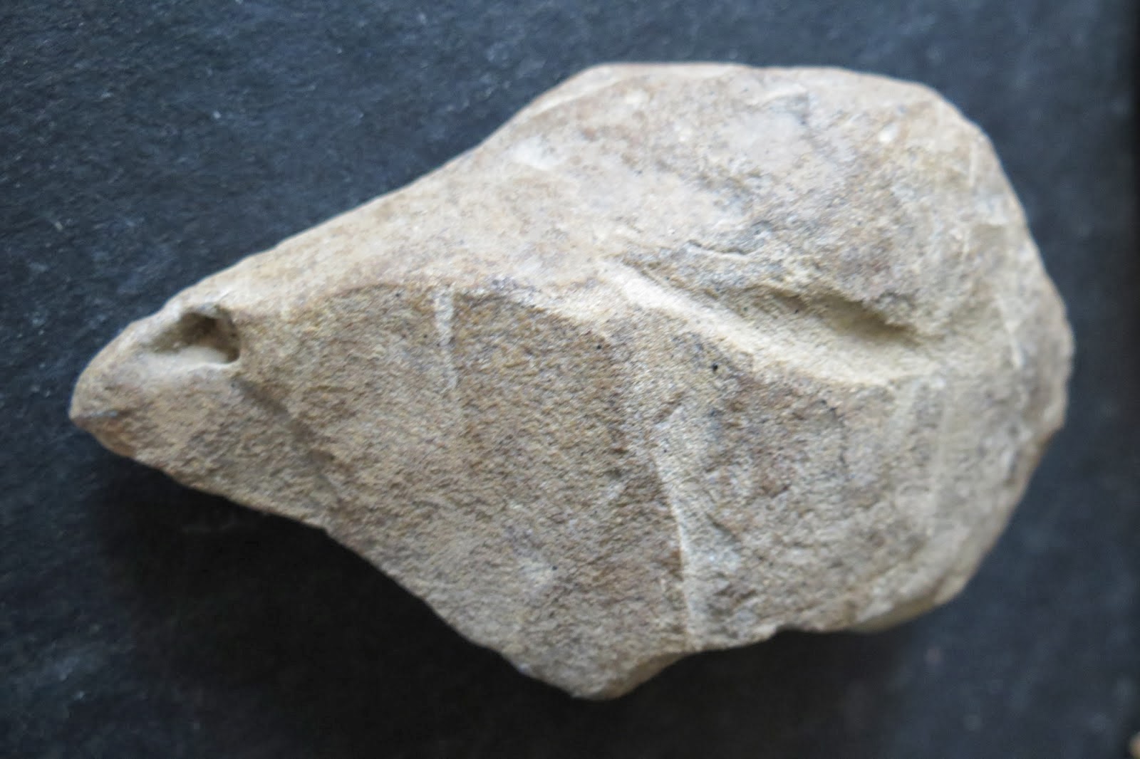 Licking County, Ohio: Interpreted by Ken Johnston as a coarse stone tool with a sharp edge fashioned as the head of a turkey vulture. The nostril accurately represents the one on the real bird.