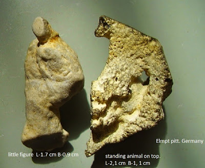 Manuported, aggregated or lightly worked iconic objects attributed to early humans from the Elmpt, Germany, gravel pit archaeological site worked by Jan van Es. Note that these figures are smaller than 2cm.