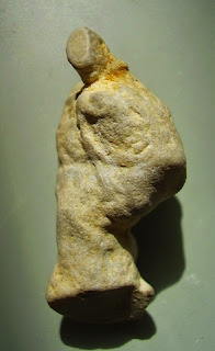 This artifact is from a geologic context suggesting a date >500,000 years old. This figure seems to have a combination of feline and human qualities. Objects like this may have been hand held props, like puppets, used in dramatic presentations and storytelling.
