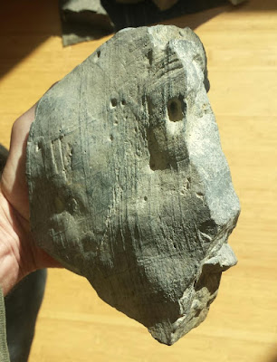 This sculpted stone is in a motif seen in many instances on this blog and in several from Arkfeld Site. This is a human head likeness in profile facing right with an expanded eye area. There have been stone removals to affect a curved nose and a tongue-like feature near the 'mouth.'